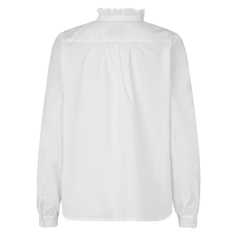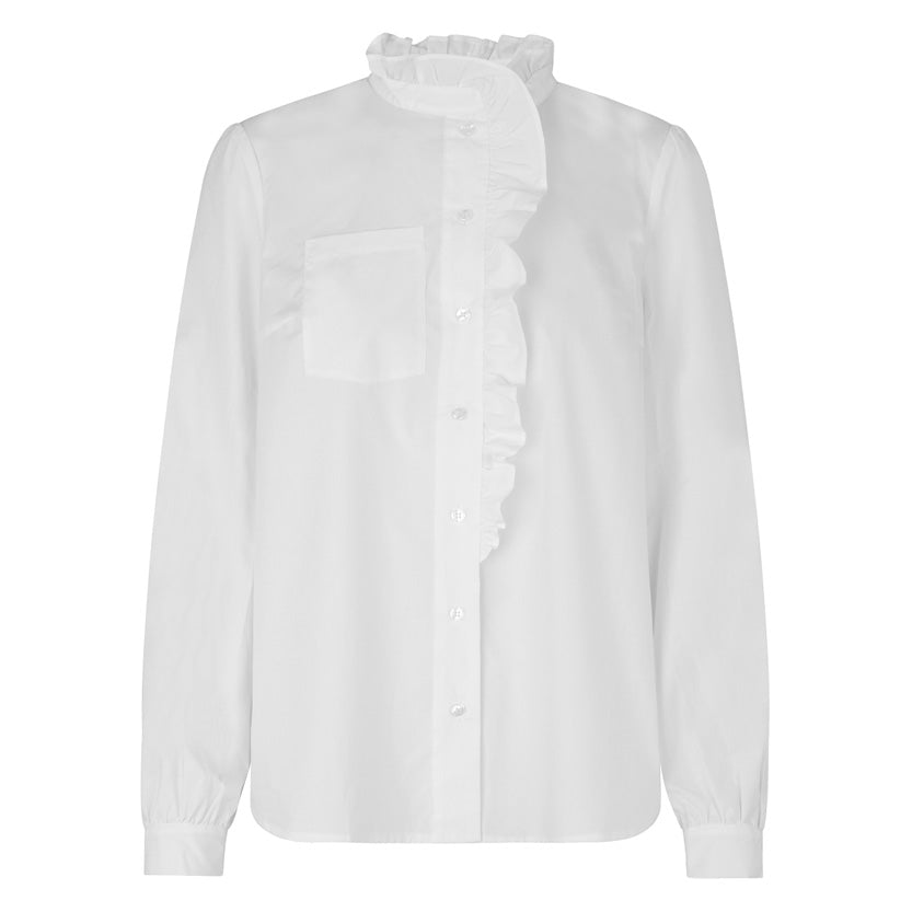 Smuk skjorte fra Baum und Pferdgarten. Denne skjorte er med en regulær pasform, gennemgående knaplukning, lange ærmer med manchet, høj hals og en enkelt brystlomme. Med en flot detalje i form af flæsekanten ved knaplukningen, der også ses i halsen.