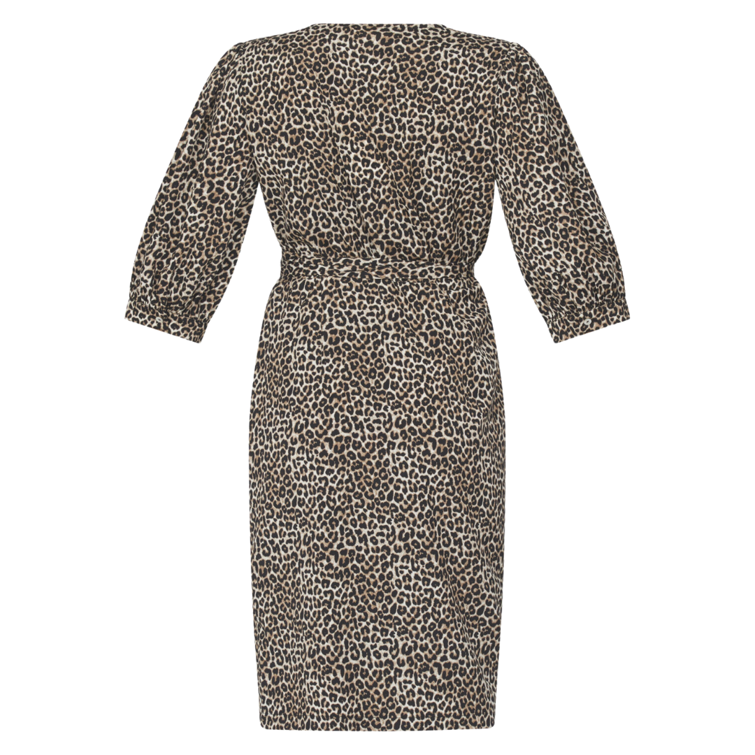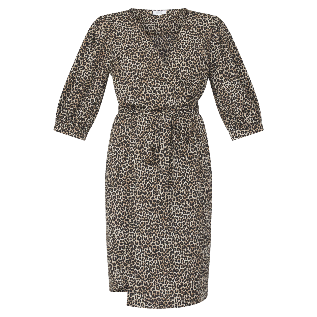 Betal med MobilepayLove913-7 fra Love & Divine er en knælang slå-om kjole i trendy leopard print. Kjolen har en tætsiddende pasform, en feminin v-hals og store albuelange pufærmer.